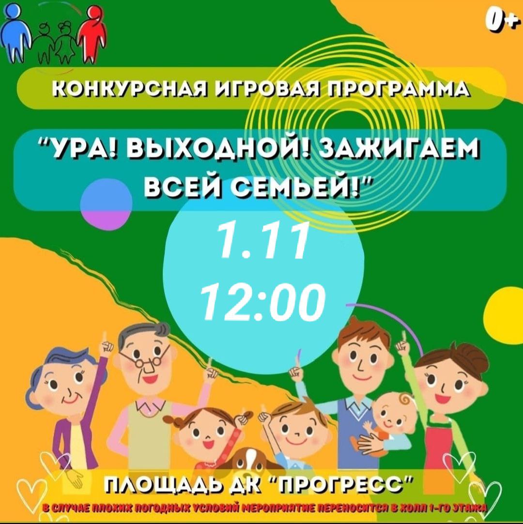 1 ноября в 12 часов на площади Дворца культуры «Прогресс» в рамках ежегодной Всероссийской акции «Ночь искусств» и в рамках проекта «В выходной – всей семьёй» приглашаем всех, всех, всех на развлекательную программу «Ура! Выходной! Зажигаем всей семьёй!».