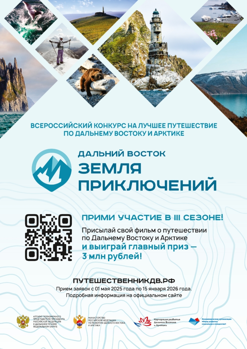 Принять участие в конкурсе могут все желающие. Подать заявку просто. Нужно снять короткометражный фильм длительностью до восьми минут о своем путешествии по Дальнему Востоку или в Арктике и направить его через сайт путешественникдв.рф.